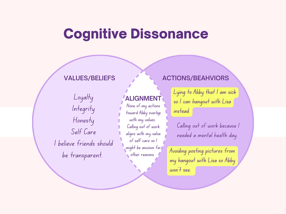 Do you ever find yourself anxious when you hang out with people you have to pretend around? Or maybe you get uncomfortable when you find yourself acting out in ways that you don’t feel represent who you are? Well, what you might be experiencing is cognitive dissonance. Cognitive dissonance describes the discomfort you feel when your actions do not line up with your beliefs or values.